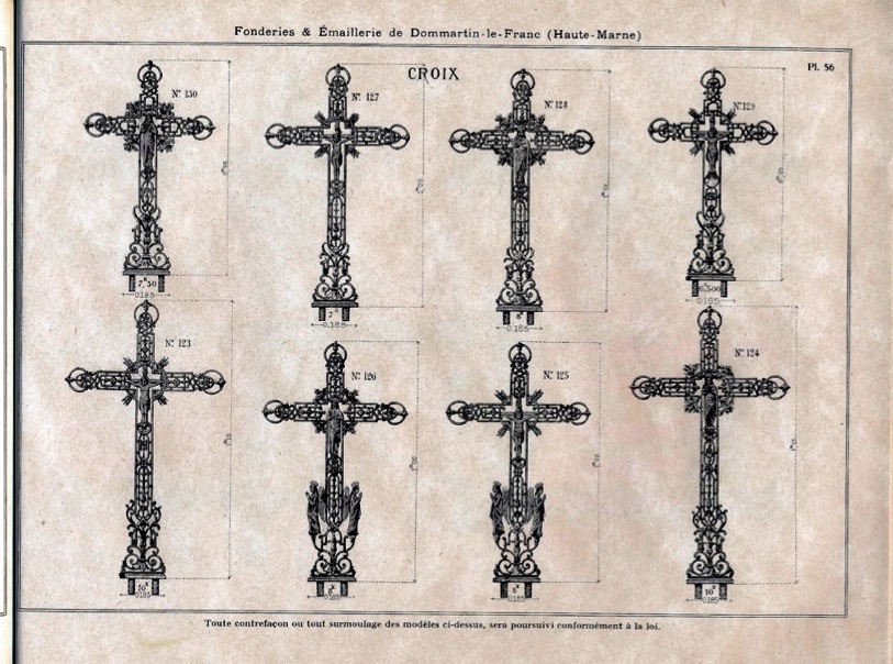 Les traditionnelles croix en pierre ont été largement remplacées par des croix en fonte, vendu par plusieurs fonderies. Chacune proposait une gamme de produits religieux et on pouvait choisir à partir d'un catalogue: l'exemple ci-dessous montre une page du catalogue de 1928 de la fonderie de Dommartin-Le-Franc dans La Haute Marne.